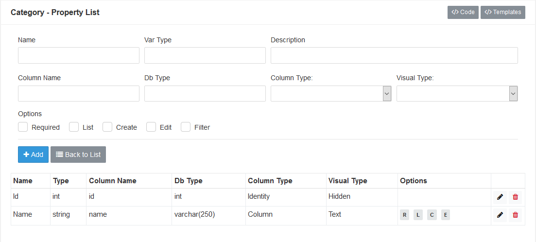Name Id Var Type int Description Id Column Name id Db Type int Column Type Identity Visual Type Hidden Options Edit - Add the Name property.